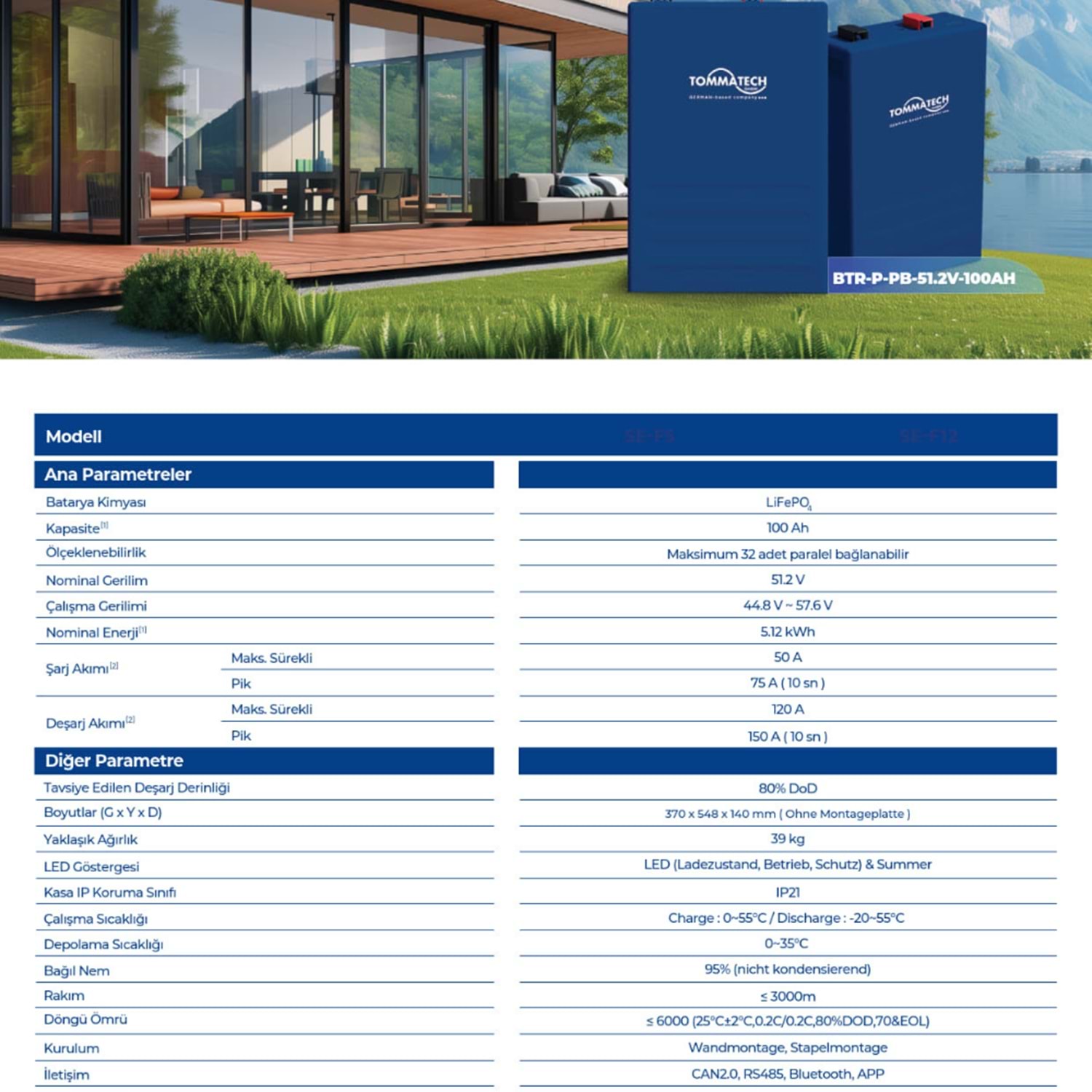 TommaTech PB Serisi Lityum Batarya, güneş enerjisi sistemleri için geliştirilmiş, yüksek güvenlikli ve uzun ömürlü bir enerji depolama çözümüdür. LiFePO4 (Lityum Demir Fosfat) kimyası sayesinde standart akülere göre çok daha güvenli ve dayanıklıdır. 5.12 kWh kapasitesi ile ev ve iş yerlerinin enerji ihtiyacını karşılar.