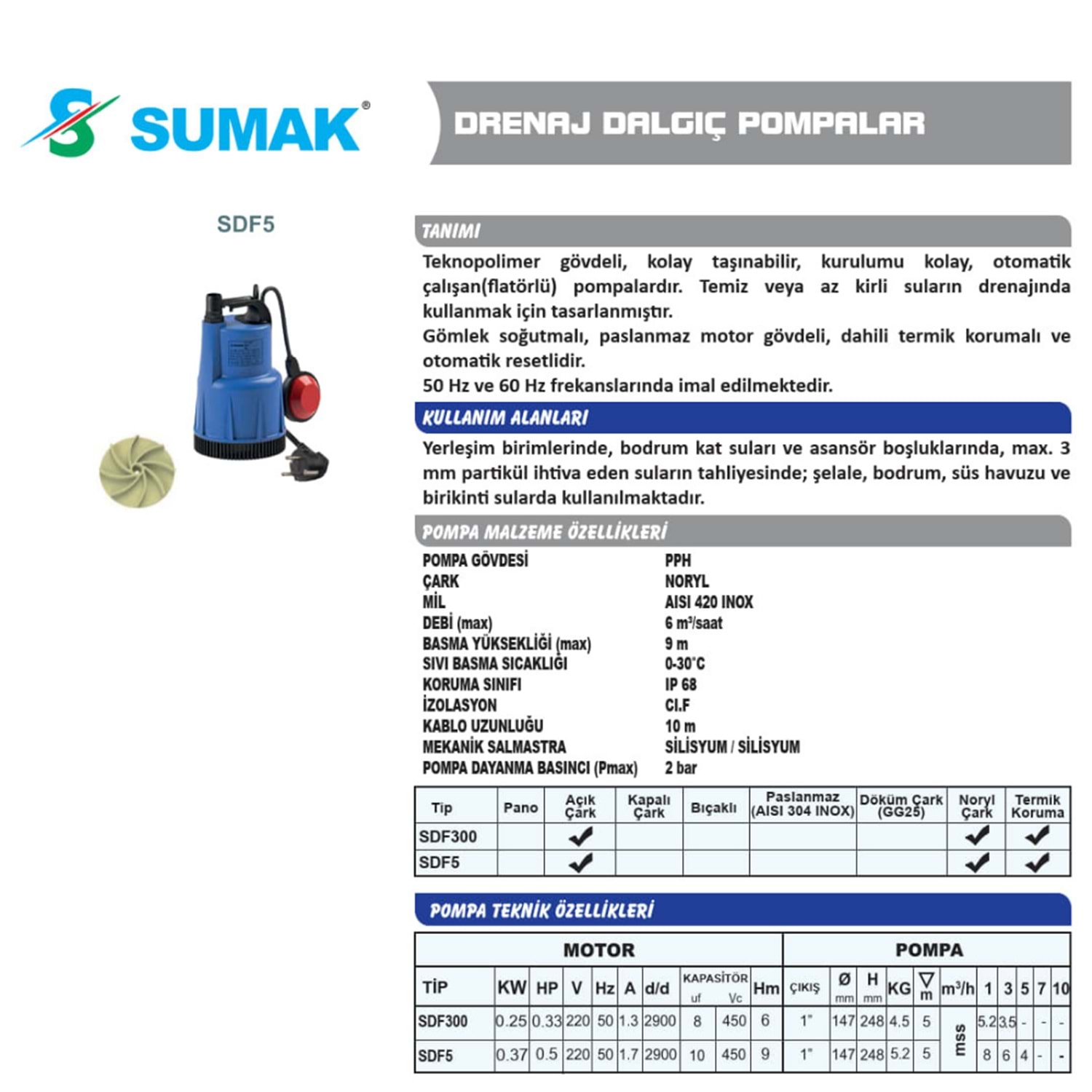 Teknopolimer gövdeli, kolay taşınabilir, kurulumu kolay, otomatik çalışan(flatörlü) pompadır. Temiz veya az kirli suların drenajında kullanmak için tasarlanmıştır. Gömlek soğutmalı, döküm motor gövdeli, dahili termik korumalı ve otomatik resetlidir. 50 Hz ve 60 Hz frekanslarında imal edilmektedir.
