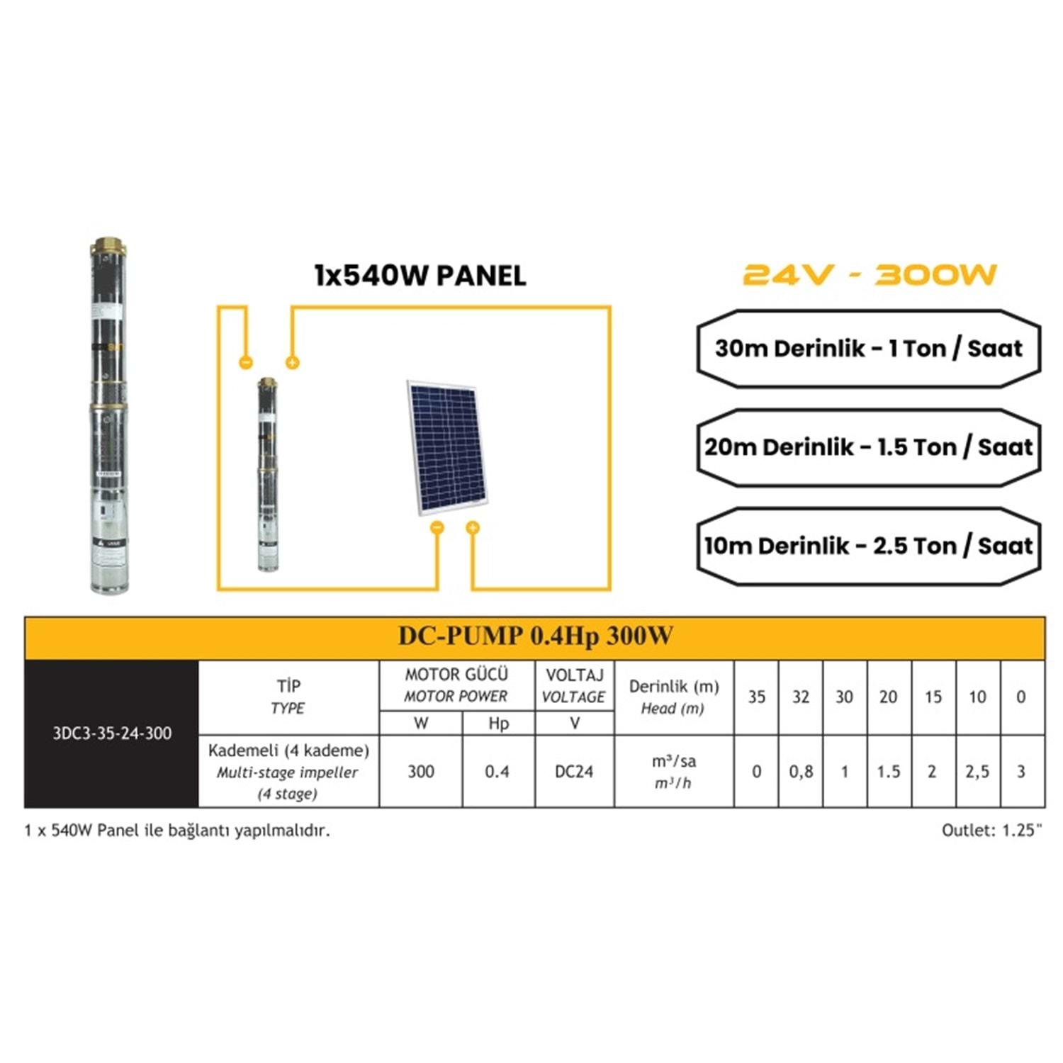Mexxsun DC-PUMP 0.4 HP 300W 24V, düşük tüketimle yüksek verim sağlayan kademeli dalgıç pompadır. Özellikle derin kuyulardan su temini için geliştirilmiş bu sistem, sadece 1 adet 540W panel ile çalışabilir. 24V DC sistemle çalışarak enerji verimliliği sağlar ve elektrik altyapısına ihtiyaç duymaz.