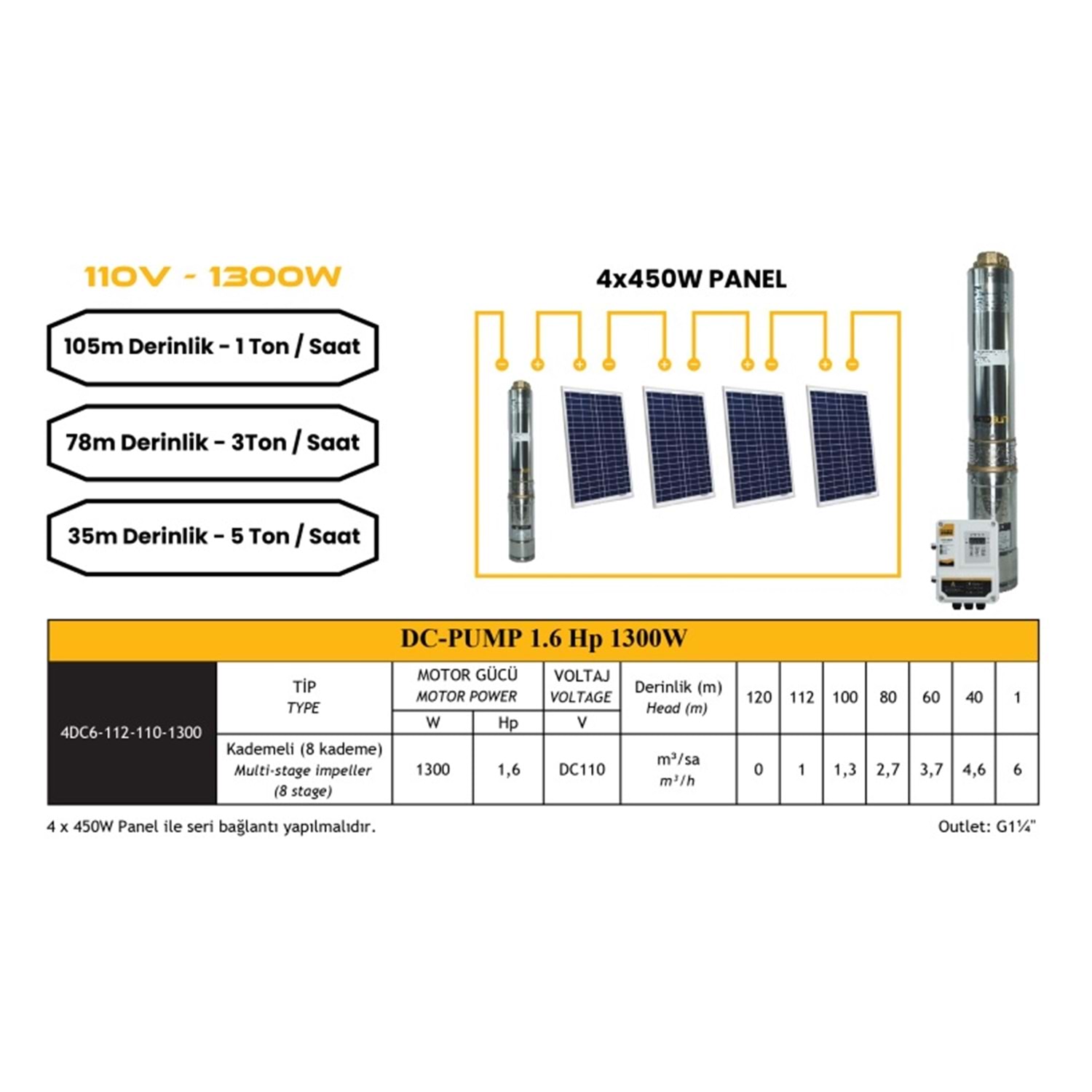 Mexxsun 1.6hp / 1300WATT / 8 Kademe / 110-200 Volt Dc Solar Dalgıç Pompa